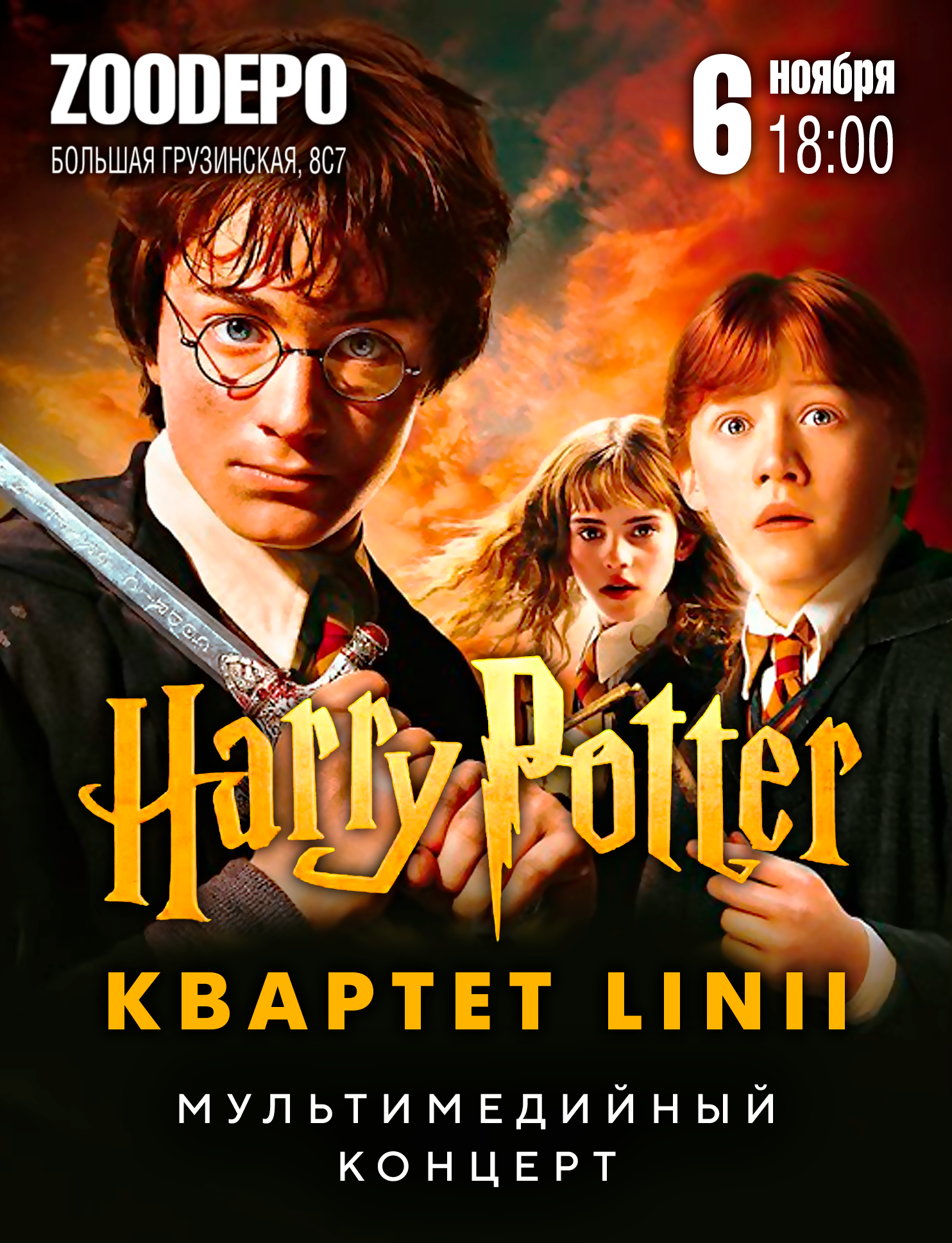 Вы ждали (12 лет в Азкабане) заветную сову с письмом из Хогвартса? Тогда для Вас у нас есть не менее приятное приглашение! Посетите концерт, посвящённый саундтрекам к фильмам о Гарри Поттере в исполнении квинтета LINII — он точно не оставит равнодушными Вас и Ваших близких.