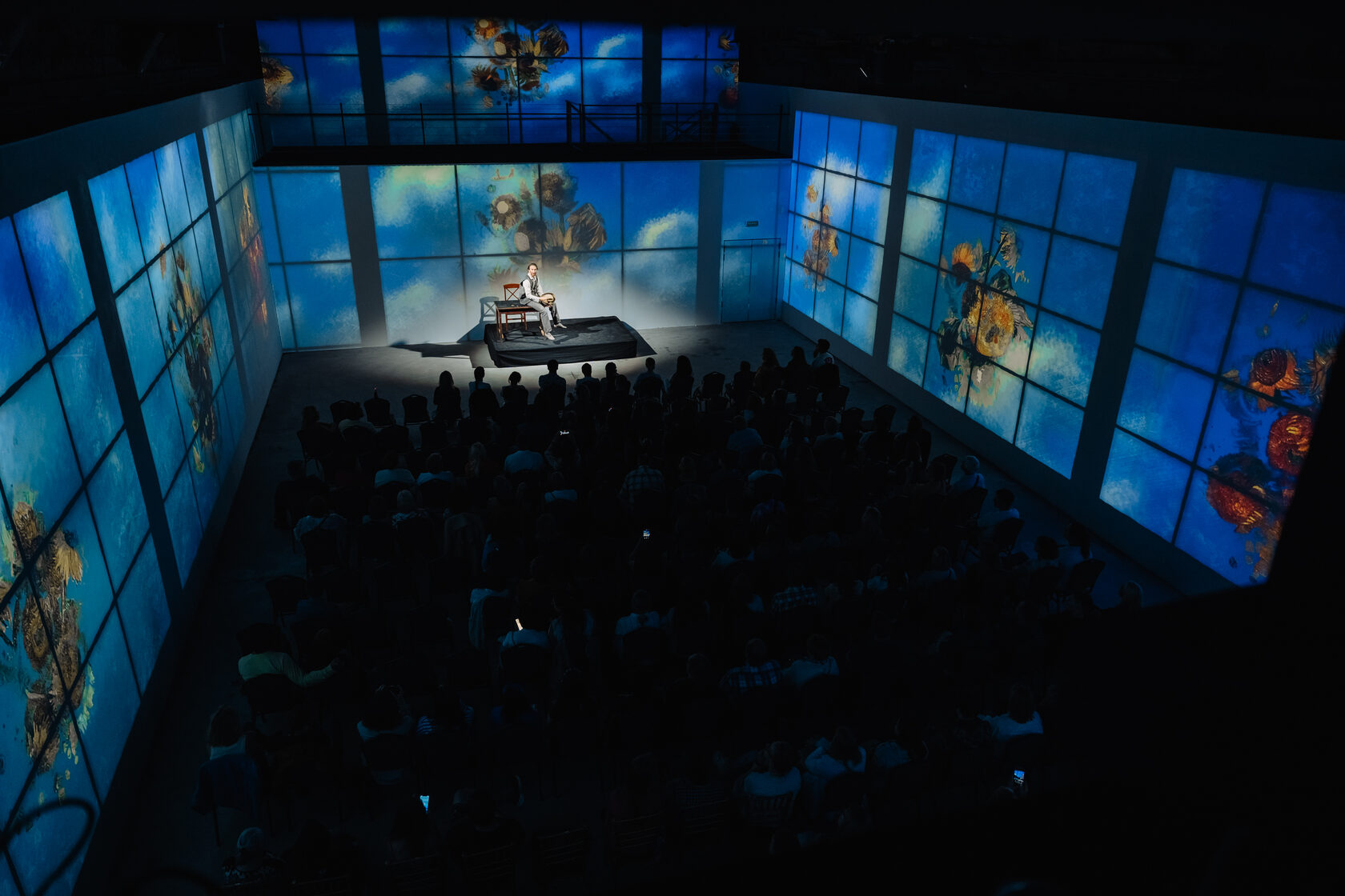 Для шоу построен специальный павильон с огромными экранами. Иммерсивный спектакль проходит в мультимедийных декорациях, захватывающие дух спецэффекты великолепную музыку,— и живую игру актеров, правдивую историю, основанную на письмах Ван Гога своему брату Тео.